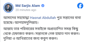 নিজের এক ফেসবুক পোস্টে সারজিস জানান, আমাদের সহযোদ্ধা হাসনাত আব্দুল্লাহ পুত্র সন্তানের বাবা হয়েছে। আলহামদুলিল্লাহ।